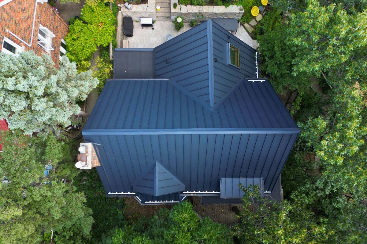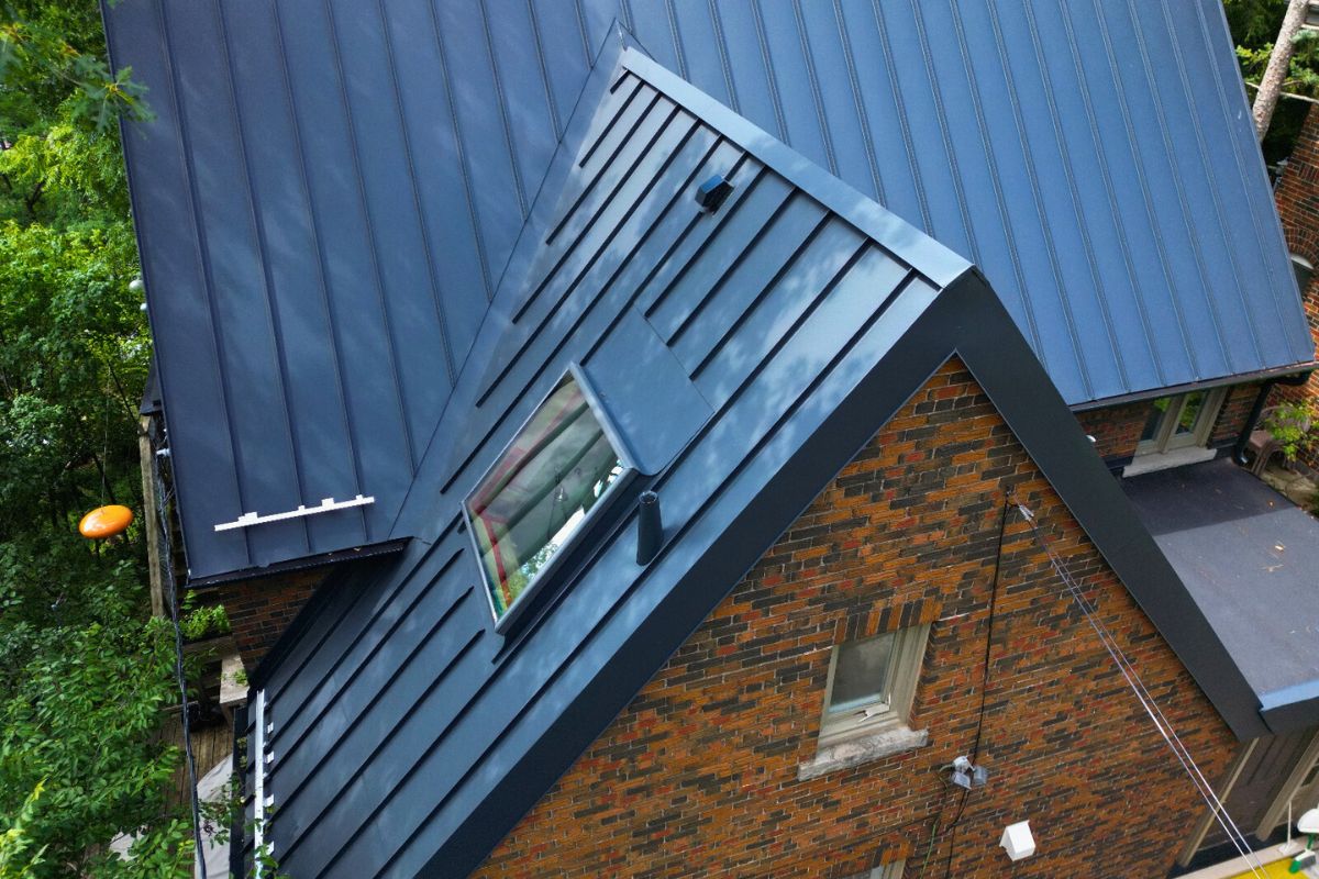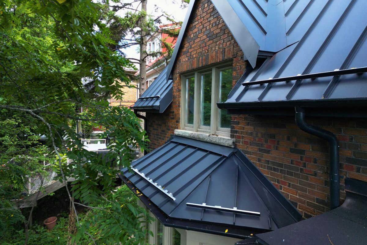 Scope: Full roof replacement with premium mechanical‑lock standing seam system; custom flashings; enlarged opening with new VELUX skylight; custom steel fascias and vented steel soffits; European square gutters with custom leaf guards, and S-5! ColorGard snow retentions system.