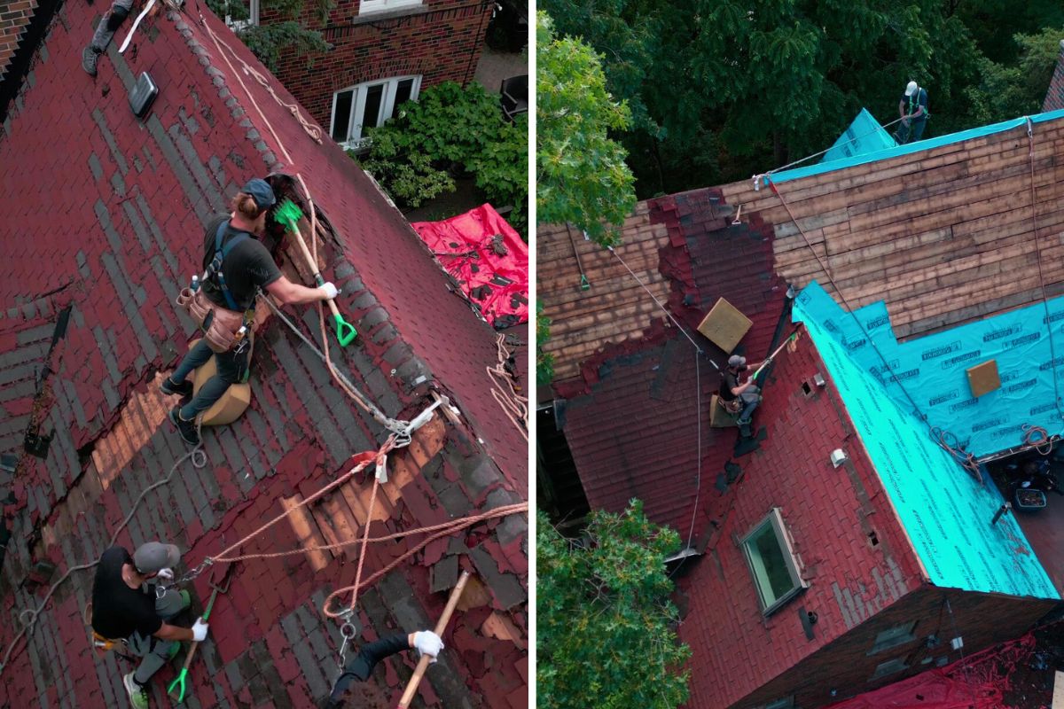 We removed all existing shingle layers across the steep 12/12 slopes with full debris control and protection for landscaping and façades. Decking was exposed for inspection and fastening upgrades.